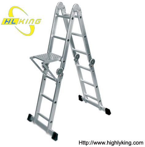 Product name:4*3 multi-purpose ladder (with workshelf) / многоцелевые лестницы item no.hm-203 material:aluminium,nylon,pp hinge:bid hinge package:1pc/shrink wrapped pack dimensions:102x28x38cm four section hinged ladder square rungs and box-section stiles give exceptional strength and rigidity large click-stopped hinges ensure a safe, positive lock in each position it can be used as: 1).step ladder 2).stairway ladder 3).leaning ladder 4).leaning ladder with standoff 5).work bench workshelf, work platform available.