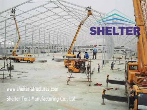 Shelter industrial stuctures is large clearspan used as temporary or semi-permanent warehouse and workshop. Due to its large inner space, forklift and other heavey machineries can moving freely inside the tent. Width spans from 30m to 50m, length can be unlimited by adding 5m long prolongation bays to the tent.