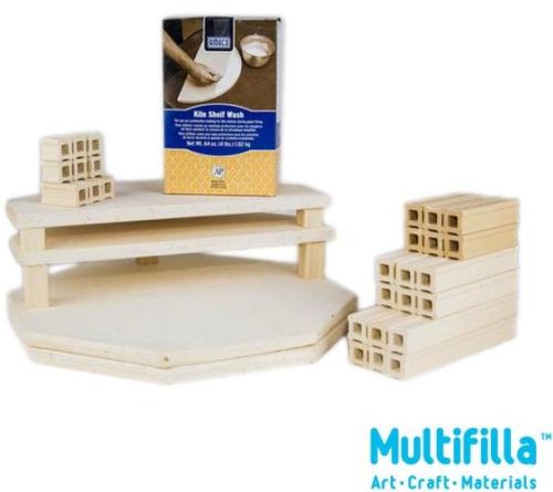 An assortment of shelves and shelf supports specifically designed for each kiln. Each EXCEL® furniture kit includes the appropriate shelves for a specific kiln and an assortment of shelf supports designed to maximize firing capacity. A 4 lb. carton of AMACO® Kiln Shelf Wash is also included which protects shelf life and allows easier removal of glaze drippings.