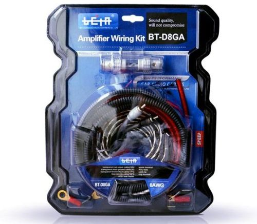 We are offering amplifier wiring kits. bt--d8ga 17 ft frosted fleible pvc blue 8ga cca power cable 3 ft frosted flexible pvc 8ga cca ground cable 17 ft transparent silver 16ga cca speaker cable 17 ft transparent cca rca cable 17 ft transparent blue cca remote cable 1pc zinc alloy plated gold fuse holder with 60a fuse 2 pcs black round terminal 1pc spade terminal 20 pcs 3*120mm cable ties 2 pcs black grommets 2 pcs black screws 4 pcs terminals for speaker cable 2 pcs blue protector case 2 pcs transparent protector case
