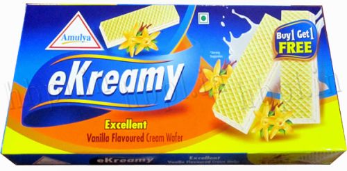 Amulya eKreamy Cream Wafers Delicious Crispy and Tasty Wafers. Three Layered Cream Wafer biscuits very good in appearance with shape and colour. and pleasant odour with flavour.Our eKreamy Cream Wafers available in many flavours Like Chocolate, vanilla, Strawberry, Orange, pineapple, banana, Mango, Coconut and Hazelnut flavours.