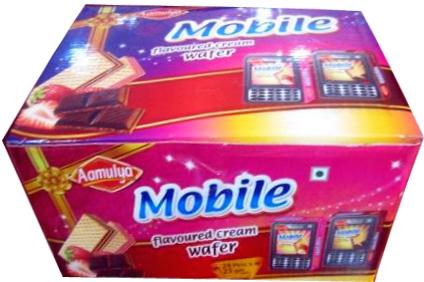 Amulya Mobile Flavoured Cream Wafers Delicious Crispy and Tasty Wafers. Three Layered Cream Wafer biscuits very good in appearance with shape and colour. and pleasant odour with flavour.Our Mobile Cream Wafers available in many flavours Like Chocolate, vanilla, Strawberry, Orange, pineapple, banana, Mango, Coconut and Hazelnut flavours.