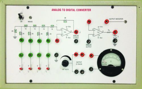 To study Analog To Digital Converter using R-2R network & Successive Approximation Method. 1 Voltmeter, 4 SPDT switches provided for selecting logic 1 & logic 0, one output indicators, Circuit printed on the front panel.
