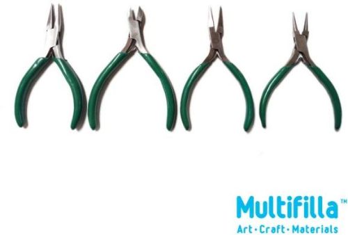 Useful set of 4 pliers consisting of round plier, flat plier, cutter and half round plier. Spring operated polished stainless steel. Categories: Handtool, Metal and Jewellery Making Handtools, Model Making Tools, Pliers