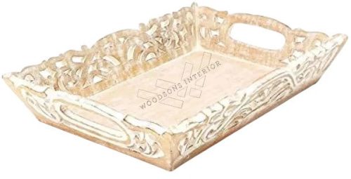Elegant whitewashed Andal Serving Tray Set made from Mango Wood & MDF. Beautiful carved design, perfect for serving or decor. Material: Mango Wood & MDF Finish: Whitewash Sizes: Large: 16" x 11" x 3" Small: 12" x 10" x