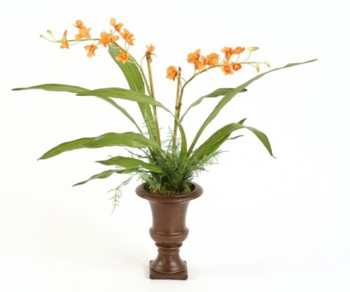 7587# - Antique Gold Dendrobium Orchids w Fern in Maple Classic Urn Container Material Ceramic Dimensions Height" x Width" x Depth" 29 x 31 x 23 Dominant Color Peach Dominant Color Family Oranges Shipping Weight 6 Ships
