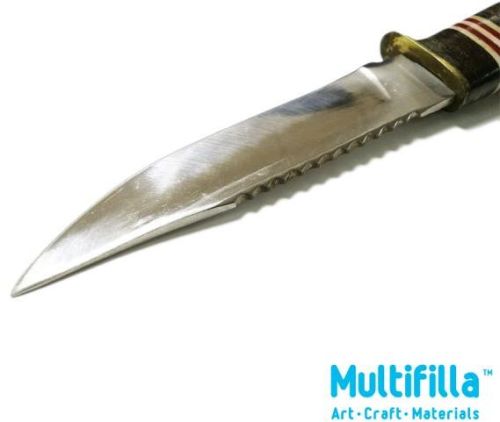 As collector item or practical use this scout knife of bygone era is proven lasting. Can be sharpened and honed to extreme sharpness. Its thick serrated metal blade is full tang and secured with a nut. The handle is leather disc stacked with decorative plastic discs. All tightened with a bolted aluminium cap and a brass furrule finger guard. As these are over 50 years slight rusting will be expected and can be sanded and removed in the sharpening process.