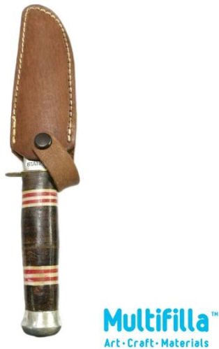 As collector item or practical use this scout knife of bygone era is proven lasting. Can be sharpened and honed to extreme sharpness. Its thick 3mm metal blade is full tang and secured with a nut. The handle is leather disc stacked with decorative plastic discs. All tightened with a bolted aluminium cap and a brass furrule finger guard. As these are over 50 years slight rusting will be expected and can be sanded and removed. Useful as garden utility knife. Keep dry and oil after use.