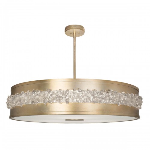Chandelier in a champagne tinted gold leaf finish featuring hundreds of rough cut crystal glass gems that refract light in a manner reminiscent to the cirrus clouds ice crystals that form the lunar halo in the frozen night sky. Also available in platinized silver leaf or matte black.