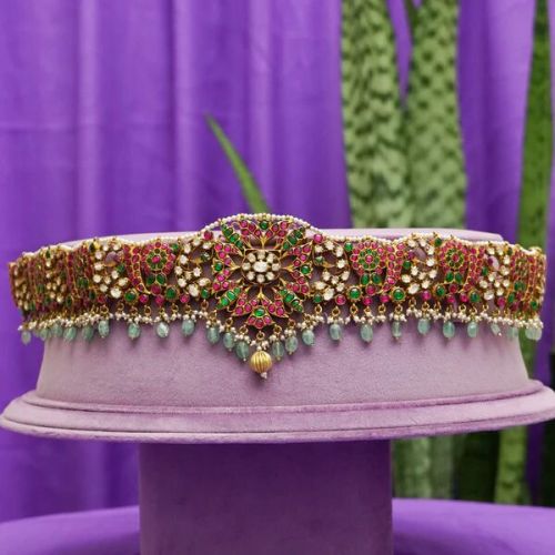 Contact SupplierArya Vaddanam is a great addition to your festive jewellery collection. This vaddanam is meticulously crafted from high-quality 92.5 silver with gold plating and is elegant and classy. The silver vaddanam features premium-quality ruby, moissanite, emerald stones, tourmaline, and seed pearls. This stunning vaddanam has an exquisite design that looks beautiful.