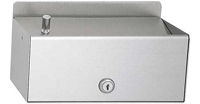 Theft resistant flip tray and bezel Satin stainless steel Spring pivoted to return to original position. Removable stainless steel ash receptacle behind locked door. Includes one lock (L-001) and one key (E114 key) 9" x 5" x 4-5⁄8"(230 x 130 x 120 mm) Press the trigger to dump butts and ashes into receptacle. Access to the receptacle is obtained by unlocking the clean out door. Clean out cycle is determined by maintenance needs. Ash receptacle tray is manually dumped into appropriate bulk refuse collection bag and then replaced into unit.