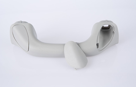 We manufacture, assemble, package, and label the assist handle highlighted here completely in-house in a volume in excess of 250,000 per year. It consists of flexible PVC overmolded onto a stamped, low carbon steel insert as well as injection molded polypropylene components. Color matching the two polymer raw materials is an important aspect towards ensuring the visual continuity of the final product.