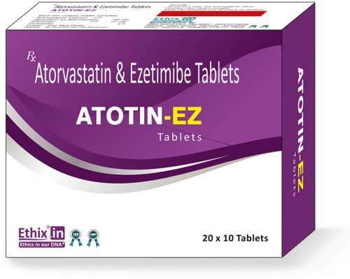 AtoTin EZ is a dual-action lipid-lowering formula combining Atorvastatin and Ezetimibe. Atorvastatin reduces cholesterol production in the liver. Ezetimibe blocks cholesterol absorption from the intestine. Together, they offer superior LDL cholesterol reduction and heart protection. Ideal for patients with high cholesterol not controlled by statins alone. Helps reduce cardiovascular risk with once-daily dosing.