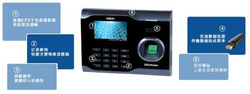 Selling points: 1.Most competitive attendance support wireless wi-fi 2.Built-in USB port allows for manual data transfer 3.Multi language support 4.CE&FCC Specification: Fingerprint Capacity: 3000 templates Transaction Capacity: 100,000 Hardware Platform :ZEM510 Communication: RS232485, TCPIP,USB-host, USB-client Standard Functions: Webserver, Workcode, SMS, DLST, Scheduled-bell, Self-Service Query, Automatic Status Switch Optional Functions: IDMifareHID,WIFI,RIS,printer,9 digit user ID Display:3 inches TFT Screen Power Supply :5V DC 2A