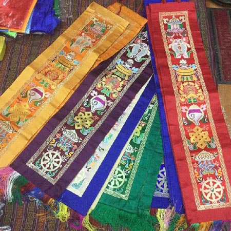 Contact Supplier8 buddha Lucky signs, Buddhist Mantra and ausp[icious signs embroidery on , brocked silk bordering all round, More than 5 different colors available 08 x 28 inches size, buddhist Wall Banners.