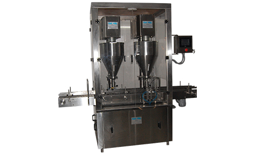 Container moving on in feed SS Slat conveyor is positioned under the funnel with the help of settable twin pneumatic stopper. Servo driven augur rotates when the container is sensed under the funnel. With the help of augur RPM and time, speed of filling and volume can be adjusted. Continuous low speed stirrer allows uniform feeding of powder in to the augur screw. Filled container then moves for further operation.