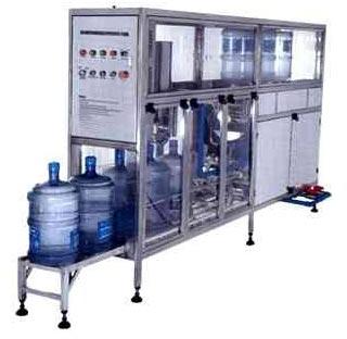 The barrels are fed to bottle holders, where the jar is washed in 4 stages with high pressure spray. After this, the bottles are put on the filling conveyor where a highly sensitive sensor activates water flow to the precise preset measured quantity. After filling, bottles automatically move for the capping stage where the caps are released to the bottles and are sealed automatically. Later, the jars are automatically ejected out to the output conveyor.