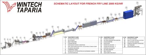 Contact SupplierProcess equipments for continuous production of par rried french fries. Capacity 1000Kg/hr. It is based on fresh Graded potatoes, having 21% solid content and ideal processing conditions. All the equipments are manufactured on a Swedish technical know how and fabricated in stainless steel-304 only. Coated Fries- we offer coated fries option with a continuous coating in line with the frying line. We offer a Coated French Fries- A new product for your market! Washing & Peeling Infeed Elevator Unit for receiving potatoes and feeding at controlled rate to the Destoner. Destoner The machine is used to remove the Dirt & Stones on the farm picked potatoes and to elevate the same to the peeler. The turbulence of water removes the adhered sand particles and also the stones. The screw feeder, driven by a constant speed motor carries the potatoes into the peeler. The unit incorporates trap doors, which can be used for cleaning after the production. Certain amount of washing is achieved to assist better peeling. Abrasive Peelers – 2 Nos. For continuous peeling of potatoes with minimum peel losses. Specially designed for safe running and low maintenance cost. Easy access for inspection & cleaning. Easy replacement of rolls. Abrasive rollers coated with special abrasive powder. Trimming Cum Inspection Table Finally peeled potatoes to be inspected on Inspection conveyor. The equipments also provide for Trim station mounted on either side of table to facilitate trimming and disposal through waste chute. Cutting, Blanching, Cooling & Drying Inclined Elevator To feed Peeled Potatoes to the Cutter for French Fry Line. French Fry Cutter Sourced From Europe For cutting of potatoes into sticks. Stick Dimensions: 3 mm to 16 mm Material: stainless steel, glass blasted. Drive components & other parts made of normal material.