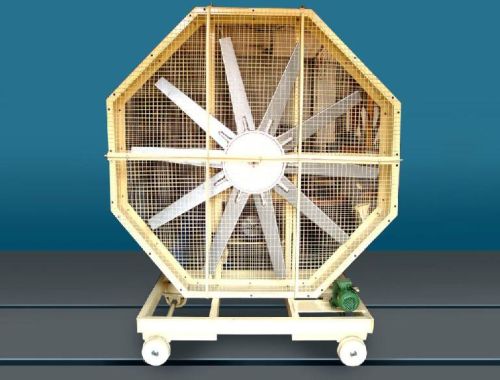The fan is of ‘axial flow’ type and it is covered with wire mesh casing and fitted on a wheeled trolley. It is dynamically balanced and hot dip galvanized for protection from rust due to aggressive/humid climatic conditions and for long life in drying shed / artificial dryer.