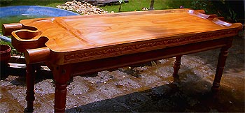 Ayurveda Wooden Massage Table made of Neem, Anjili or Wenga Wood with standard wooden stand, heavy duty, with brass protection. Single piece or single joint top massage table. Used for Ayurvedic Massage, Pizhichil and Shirodhara, Multipurpose table, special design...