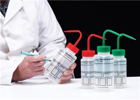 Azlon Plastic Wash Bottles are stocked in Dynalon's Rochester, NY warehouse for immediate shipment throughout the North American marketplace. Azlon plastic wash bottles are supplied in a full range of capacities. Azlon plastic Driplok Wash Bottles with PP closures pictured at left feature the only venting system that dispenses solvent as efficiently as a standard wash bottle. This venting system consists of a valve specifically designed to allow volatile solvent vapors to escape, but seals completely when in use to dispense a powerful, spatter-