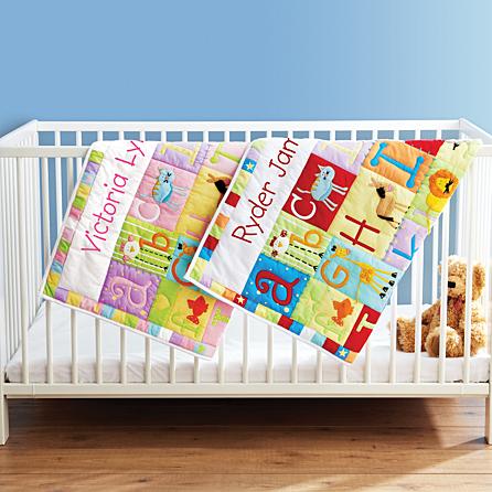 Baby will adore the gentle animals and colorful ABC’s on this sweet quilt. Loaded with unexpected embellishments (yarn tails, yarn patchwork and varying soft textures). Made of 100% cotton with 100% poly-fill. Personalize with any message on 1 line, up to 18 characters. Machine wash. Measures 42"Lx32”W. Item
