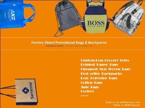 hipromos.com covers wide ranges of factory direct cheap bags for your clients or recipients, like custom logo grocery totes, printed paper bags china, cheapest non-woven bags, best-seller backpacks, top-selling logo polyester bags, budget cotton bags supplier, china jute bags factory, lowest price coolers.....