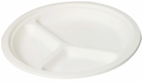 Strong, eco-friendly plate made from sugarcane bagasse with three compartments to separate food portions. Microwave-safe, oil-resistant, and fully compostable
