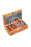 Brass, chrome plated, in case with lid, complete set with forceps and light metal fractional weights.