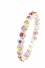 This bangle is studded with (cz)& multi sapphire stone.The platting of metal is done by Rhodium. This bangle has high end fashion design which has elegance and style that will add radiance to natural beauty of women.