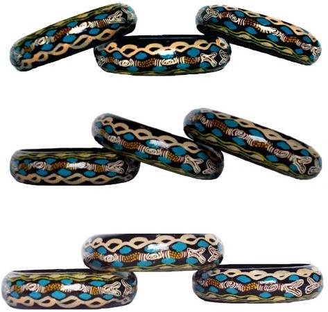 we offer Bangle. Attractive painted laquered bangle depicting My Countryt by Jane Oliver - Keringke Arts. Approximately 2cm wide. Keringke artists use pattern, colour, shape and design to create paintings that depict their sense of country, culture and self.