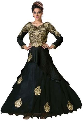 We are offering banglori silk salwar kameez. Zari, resham embroidery with embroidery butta and lace border front:37",back:46" 40" lengha:waist:40", length:44", semi stitch lengha