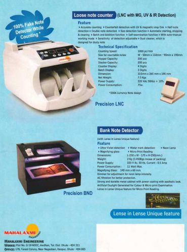 We are offering bank note detector, loose note counter. the bank note detectors are used for cross chake of the features in bankcurrency notes, it helps to detect the fake note, it also helps to stop the fake notes in circuletions ans save the netions economy.
