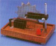 For demonstrating the conversion of electric energy into mechanical energy. Star-shaped copper disc 9 cm. Diameter rotatable vertically on pair of adjustable centers and dipping into mercury trough between the vertical limbs of a small horseshoe magnet on a wood base 15x 10 cm. Disc adjustable vertically on metal pillar which is connected to one of two terminals mounted on base. The other terminal is connected to the mercury trough. The apparatus will operates on 4 volts at which voltage it takes 1.8 amps., without battery.