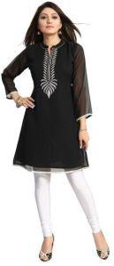 Description This designer Indian Tunic Top worked out in Black is ethereal and subtle. It has a Chinese collared neckline. It has a delicate and exquisite work on the neckline. The work is diamond shape stones and white beads. The sleeves are long and the edge of the sleeves has a beautiful silver piping. The bottom of this party wear tunic is finished with silver piping too. It is a perfect day wear. It is formal and classy. You would be the bearer of all the compliments with this attire on. Pairing it up with the white coloured churidar leggings would look the best.