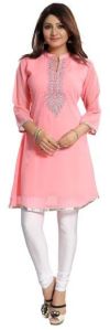 Description This designer Indian Tunic Top worked out in Coral is ethereal and subtle. It has a Chinese collared neckline. It has a delicate and exquisite work on the neckline. The work is diamond shape stones and white beads. The sleeves are long and the edge of the sleeves has a beautiful silver piping. The bottom of this party wear kurti is finished with silver piping too. It is a perfect day wear. It is formal and classy. You would be the bearer of all the compliments with this attire on. Pairing it up with the white coloured churidar leggings would look the best.