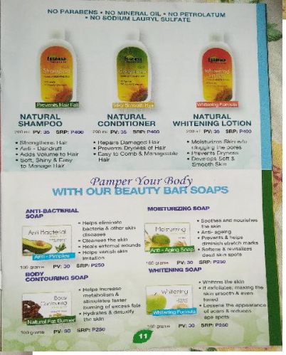 Contact SupplierThis consists of 4 different kinds of soaps namely: Body Contouring, Anti-Bacterial, Whitening and Moisturizing soap, each costs US $70 per dozen or US $6.00 per piece. Body Contouring soap helps increase metabolism and stimulates faster burning of excess fats. Hydrates and detoxify skin. Anti-Bacterial soap helps eliminate bacteria and other skin diseases, cleanse the skin, heals external wounds, helps vanish skin inflation. Whitening soap whitens the skin, exfoliates making the skin smooth and even toned, lessens the appearance of scars and reduces age spots. Moisturizing soap soothes and nourishes the skin, anti-aging, prevents and helps diminish stretch marks, softens and revitalizes dead skin spots. This 4 soaps really pampers your body.