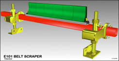 Specially formulated polymeric blades gives maximum life, and keep the possibility of damage to belt repairs, splices and metal fasteners to a minimum. Patented blade design ensures optimum combination of flexibilty and stiffness to adapt to belt profile. Patented V base blade mounting makes blade changing simple, eliminating the need to remove the scraper from its mountings. Brelko torsion mountings allow the scraper to maintain a constant pressure on the belt and greatly extend adjustment intervals. Also available with standard adjustable mountings.