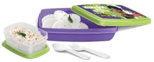 Description  Easy to open, easy to carry tiffin for your kid ! The tiffin can carry sufficient food for school going kids and easily fits in their school bags.  Features Leak proof inner container. With spoon and fork Trendy shape Attractive over prints of Shiva Colours - Voilet & Green, Pink & Red, Green & Maroon, Yellow & Red
