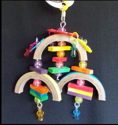 We LOVE this new toy! Cardboard Birdie Bagels, wood, beads, baubles, shiny trinkets, pacifiers - and a bell too! Measures 9" long x 7" wide. For all medium sized parrots.
