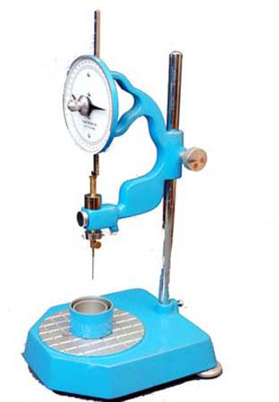 The apparatus consist of a cast aluminium base with an iron stand on which moves an aluminium arm. A 6" dial is fixed on this arm and a brass chromium plated rod slide through the lower portion of the arm. A needle with weights is fitted to this rod. The dial is graduated from 0-400 in one tenth millimeter sub division. Supplied complete with adjustable needle holder, penetration needle sample container, transfer dish and weight of 50 gms.