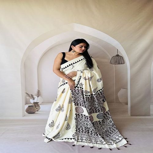 Black and Cream Hand Block Printed Modal Silk Ajrakh Saree?