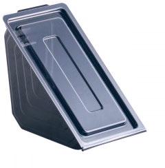 Clear hinged lid with black base for fresh and chilled sandwiches. Very good frozen and refrigerated performance. Good moisture and oxygen barrier properties with brilliant clarity.