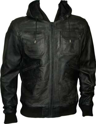 leather hooded jacket offered by us, is fabricated from genuine leather (cowhide/sheepskin). this black leather jackets has 100% polyester lining, knitted trim on cuffs and belt, and front two cargo pockets on chest.