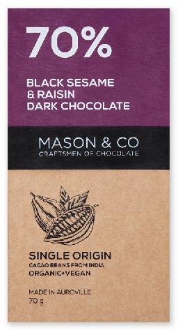Our gourmet version of the wildly popular fruit and nut combination!Tart raisins sprinkled on smooth dark chocolate fused with nutty black sesame to create a delicious and texture rich bar. Perfect for the nostalgic chocolate lover looking to try something dark! Organic, vegan, gluten free & soy free.