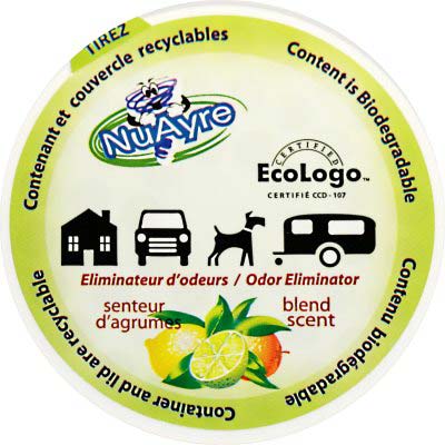 NuAyre gel paste colored and scented accordingly to your choice of scent. SPECIALLY for people that love the CITRUS SCENT AS A REFRESHER. Eliminates odor naturally. Work as well as our leader product Fresh tested on 14 different odors : cigaret smoke, cooking odors, animal odors , peint, wood smoke, burnt materials, moisture odor, vomit, heating oil, gaz, kerozene. Use into cubboards, drawers, closets, under sinks, in garage, every room in the house, storage box, suit cases etc. Left overs may be placed at the bottom of the garbage can before inserting the bag.