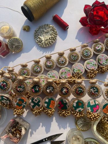 Contact SupplierEach pair of lumba is stitched together on one piece of thread. The lumba which holds the flowers is 1.5 inches in diameter. Each lumba is attached to a wooden bead which is wrapped with rose-gold tone Gota Patti. For the hooks of the toran, the silk thread is stitched with small beads into a loop. The total length of each tasseled lumba bunch is 5 inches.
