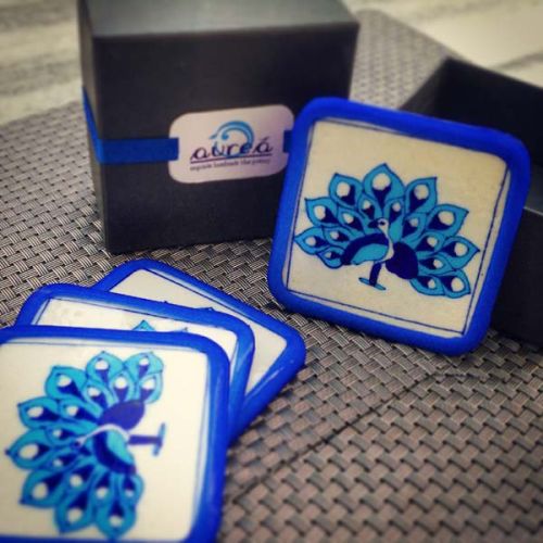 Handmade Jaipur Blue Pottery coaster set of 4 pieces. Each piece has a rubber casing for chip resistance and a scratch free surface.