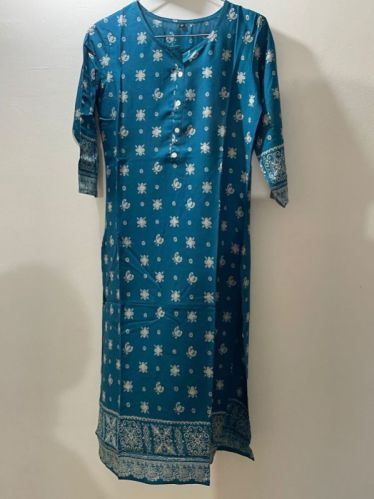 Blue Rayon printed kurti Length: calf length Sleev : three quarter Size: all sizes availble
