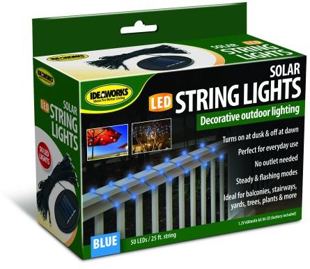 SOLAR STRING LIGHT – BLUE Made with 50 decorative LED lights with 25ft. cord.. Sun charges lights by day and they automatically turn ON at night. Decorate your balcony, stairway, yard, trees & plants all year long. ID JB6624BLU BRAND IDW-GNO CASE PACK 24 CASE WEIGHT 12.6 CASE LENGTH 16.3 CASE WIDTH 10.4 CONSUMER PACK COLOR BOX CONSUMER PACK DIMENSIONS 6.7 X 2.4 X 5.7 UPC EAN NUMBER 017874014453